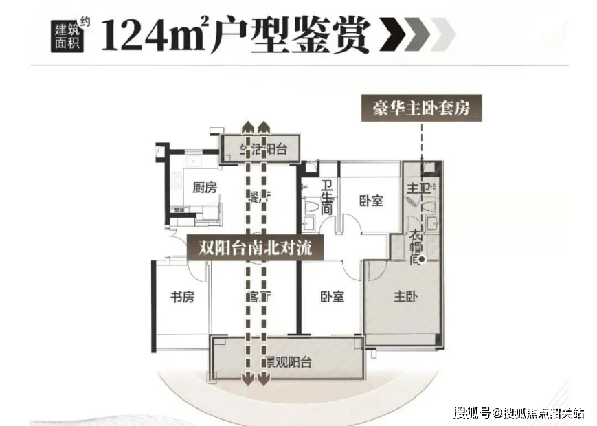 124㎡四房户型在121㎡四房户型的基础上,优化了空间尺度,提升了收纳功能,居住舒适度更高,根据官方备案数据,该户型建筑面积124㎡,套内面积约99㎡,公摊率约19.8%,南北对流,四开间朝南,6.4米阳台连通客厅,主卧带独立衣帽间与干湿分离卫浴,总价约500万起,适配对居住舒适度有更高要求的二胎家庭或改善家庭。