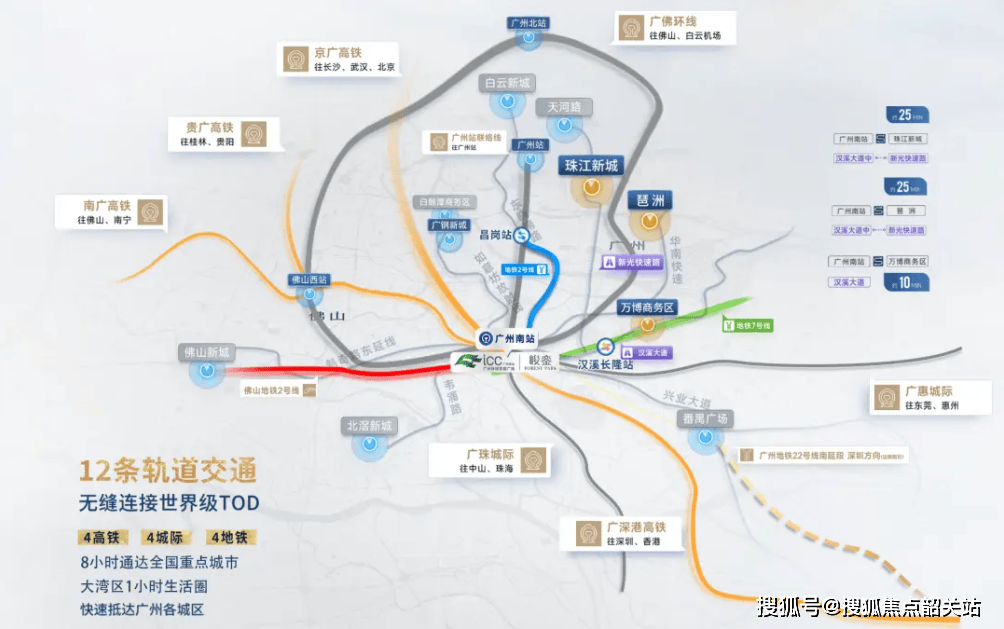 项目步行5分钟即可抵达广州南站,作为世界级交通枢纽,广州南站坐拥“4高铁+4城际+4地铁”的12轨交汇网络,是大湾区互联互通的核心节点,具体如下: