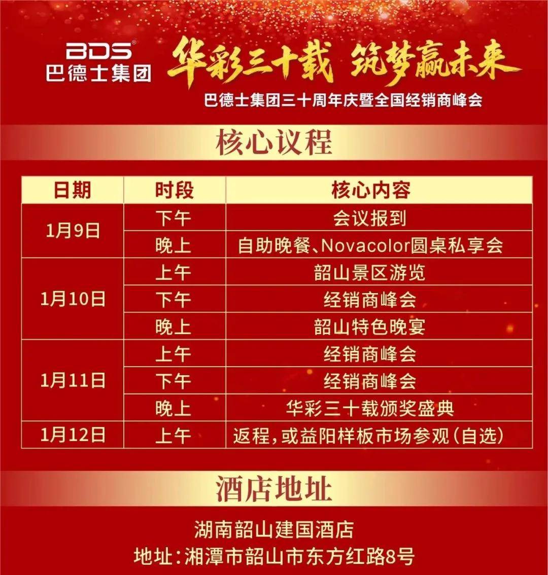 盛典帷幕即将拉开,巴德士集团30周年庆暨全国经销商峰会,定于1月9日-12日在湖南韶山盛大举办,如今已进入倒计时3天。