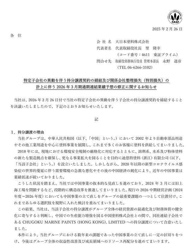 而从中涂化工整体经营来看,此次收购对其短期业绩影响有限,长期战略价值显著。2026财年前三季度,中涂化工全球销售额达1019.30亿日元(约合50亿元人民币),同比增长6.1%;净利润87.99亿日元,同比下降17.7%。业务板块中,船舶涂料、工业涂料分别同比增长6.3%、7.6%,集装箱涂料同比下滑13.8%,这也印证了其2023年出售上海第二工厂、剥离疲软业务的战略正确性——聚焦核心优势领域,实现资源高效配置,与当前全球涂料行业整合的核心逻辑高度契合。