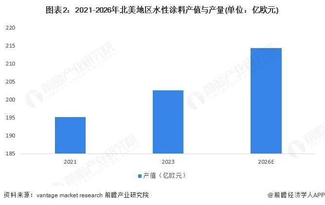 根据Vantage Market Research披露的数据,2021年北美地区水性涂料产值为195亿欧元,并且将以年复合增长率1.9%的速度增长至2026年的214亿欧元;2021年北美地区水性涂料产量为608万吨,并且将以年复合增长率2.8%的速度增长至2026年的698万吨。
